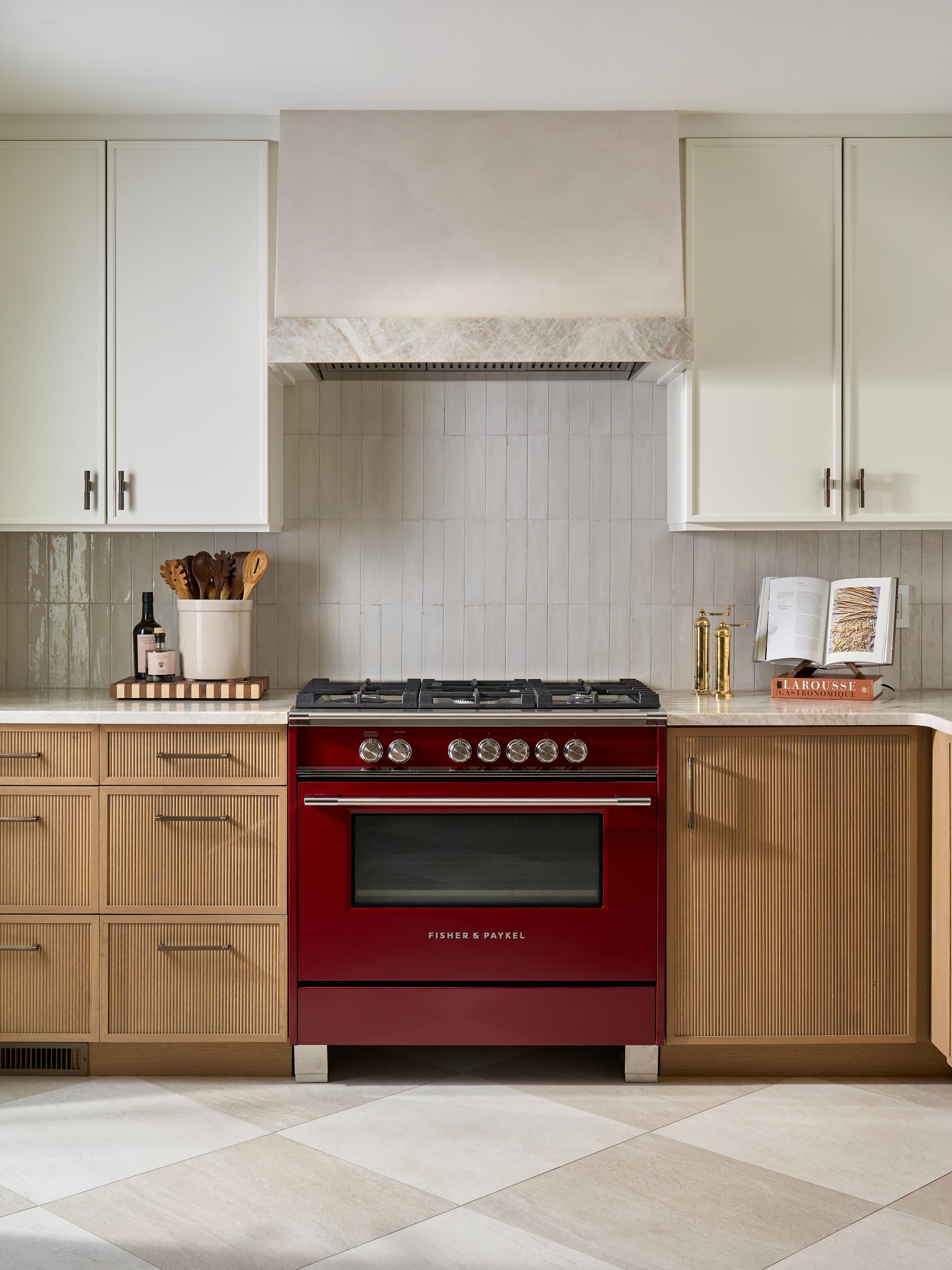 One of our favorite ranges from Fisher & Paykel in our Lavallette project. Brings a pop of color into the space while offering serious burner output. Photo by Max Lemoine.